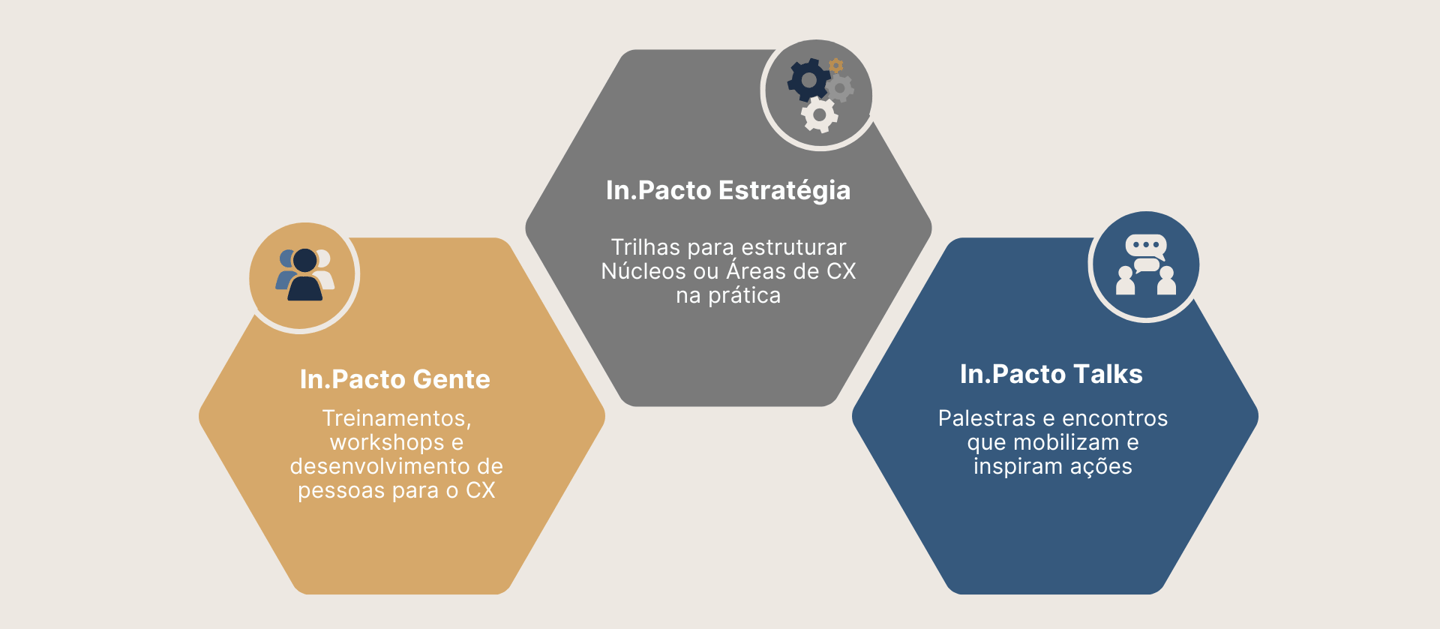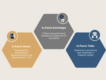 A In.Pacto transforma propósito em prática com soluções que integram desenvolvimento humano, estratégia de CX e liderança mobilizadora. Conheça nossas três frentes de atuação: